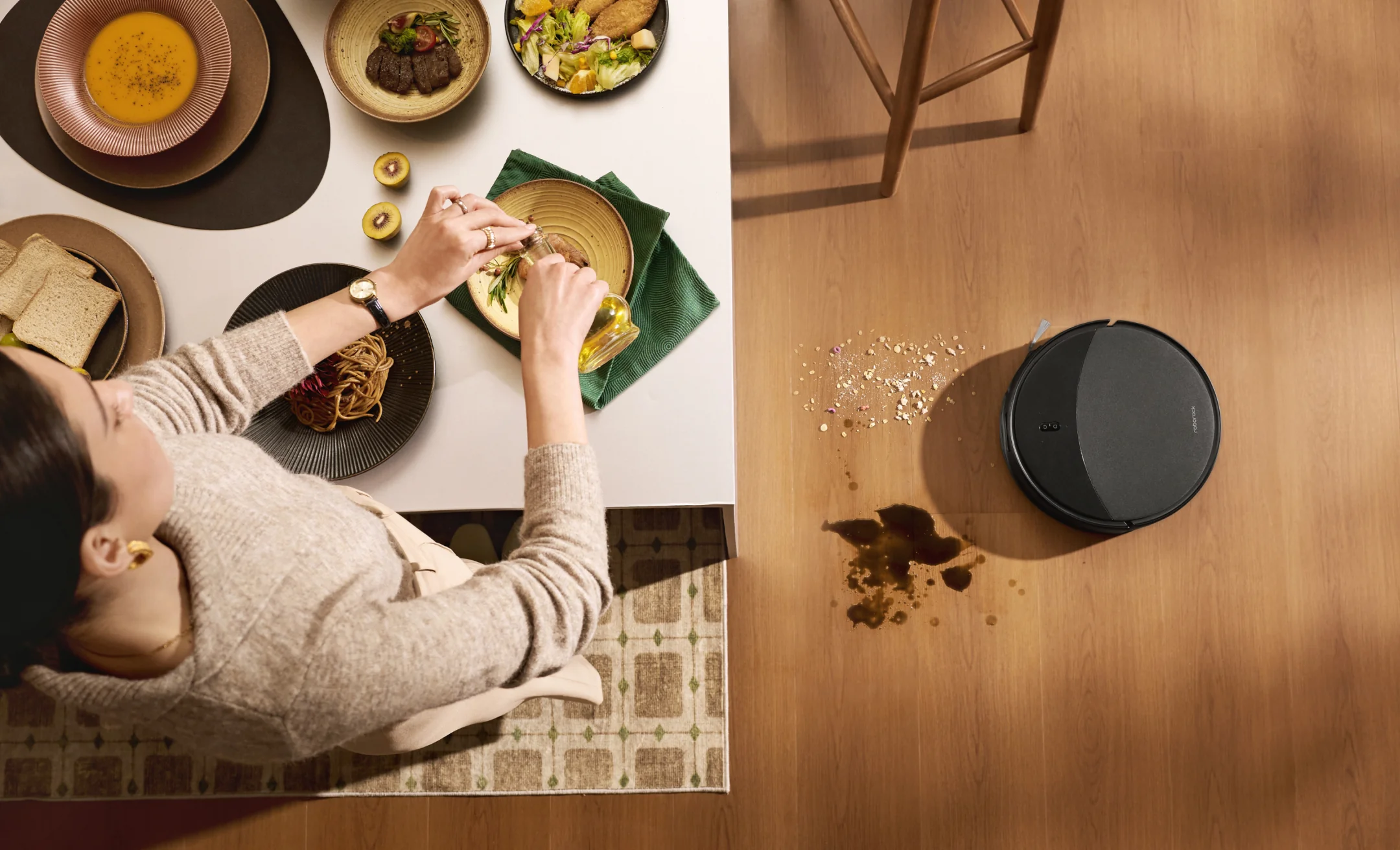 Besonders auffällig ist die sehr flache Bauweise. Dadurch kann der Roboter unter vielen Möbelstücken reinigen, etwa unter Sofas, Betten oder Lowboards. Gerade in Wohnungen mit viel Mobiliar ist das ein entscheidender Vorteil, weil dort häufig Staub liegen bleibt.